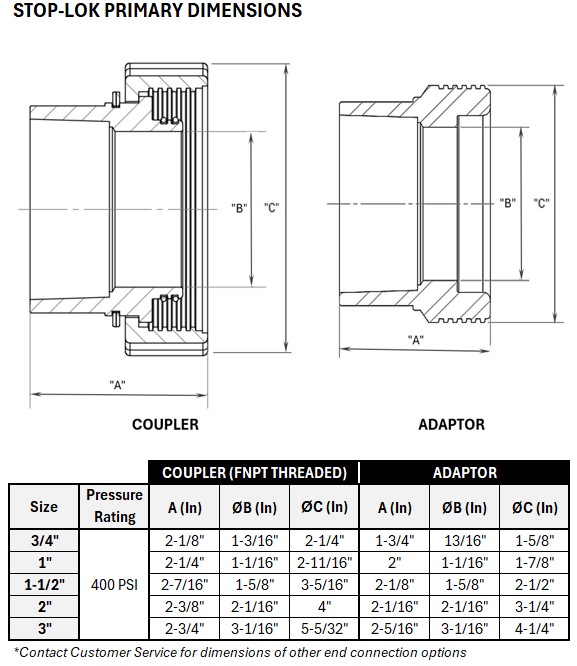 Available in 3/4-, 1-, 1-1/2-, 2- and 3-inch sizes, Stop-Lok™ couplers are constructed of 316 stainless steel and have an operational temperature range of -20ºF to 400ºF (-29ºC to 204ºC).